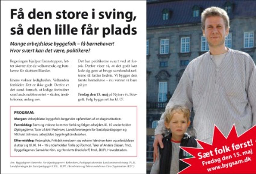 Bygningshåndværkere, lærlinge og pædagoger viser, hvordan det er fornuftigt at bruge ledige håndværkerhænder til at sikre velfærden – for eksempel flere børnehaver – og dermed få løst et problem med manglende institutionspladser. Ved en aktion på Nytorv fredag den 15. maj blev der bygget en symbolsk børnehave for at understreget at alle har noget at vinde.